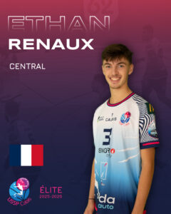 3 Ethan RENAUX 1. Ugo QUINQUIS2. Laouenan LONQUETY3. Ethan RENAUX4. Esteban MAHIEU6. Thomas LAPIERRE7. Ryan UTIA8. Baptiste FOCARD9. Tom LEROY10. Donovan TEAVAE11. Juan David HURTADO13. Mathis DUWICQUET14. Mohamed EN-NAKHAI16. Swan LEGRAND51. Robin ANOT #3NomEthan RENAUXNationalitéFrancePositionCentralTaille193L'équipe actuelleLISSP CALAISLiguesELITESaisons2024-2025, 2025-2026Age0