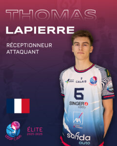 6 Thomas LAPIERRE 1. Ugo QUINQUIS2. Laouenan LONQUETY3. Ethan RENAUX4. Esteban MAHIEU6. Thomas LAPIERRE7. Ryan UTIA8. Baptiste FOCARD9. Tom LEROY10. Donovan TEAVAE11. Juan David HURTADO13. Mathis DUWICQUET14. Mohamed EN-NAKHAI16. Swan LEGRAND51. Robin ANOT #6NomThomas LAPIERRENationalitéFrancePositionRéceptionneur AttaquantTaille190L'équipe actuelleLISSP CALAISLiguesELITESaisons2023-2024, 2024-2025, 2025-2026Age3